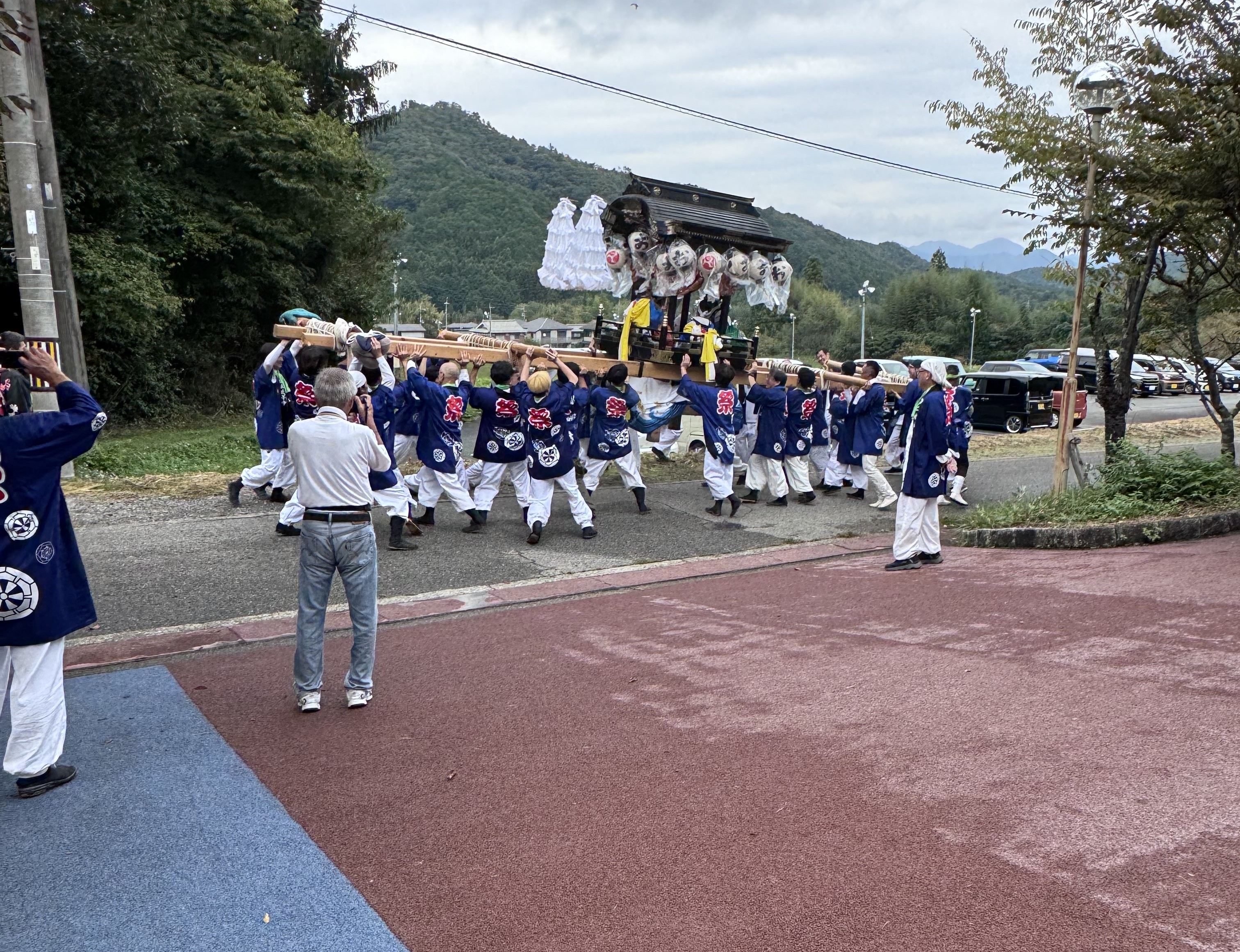 10月12日(日)、味間地区の二村神社のお祭りがあり、今年も地元味間奥の山鉾と太鼓神輿がやすらぎ園まで巡行してくださいました。
