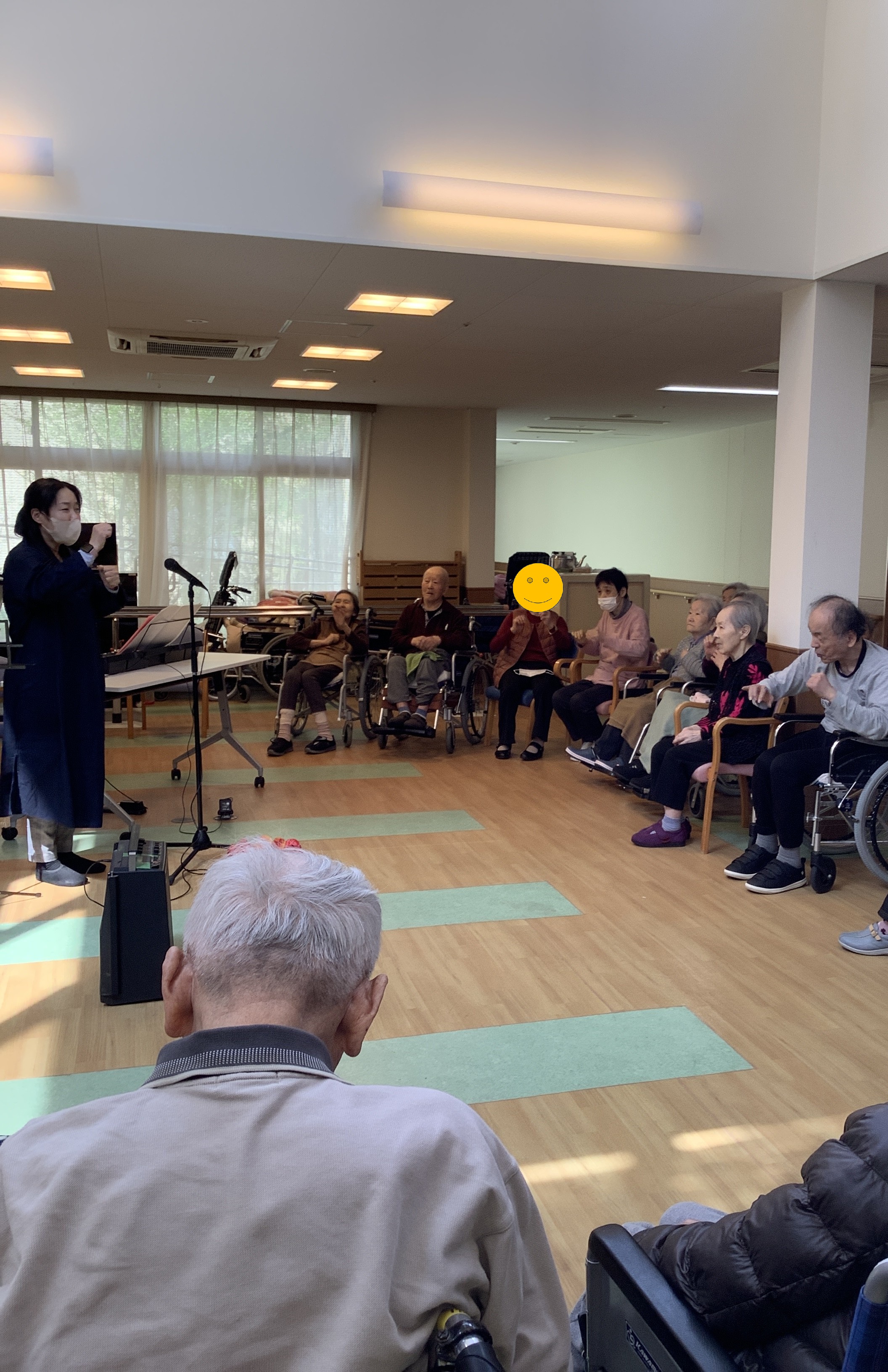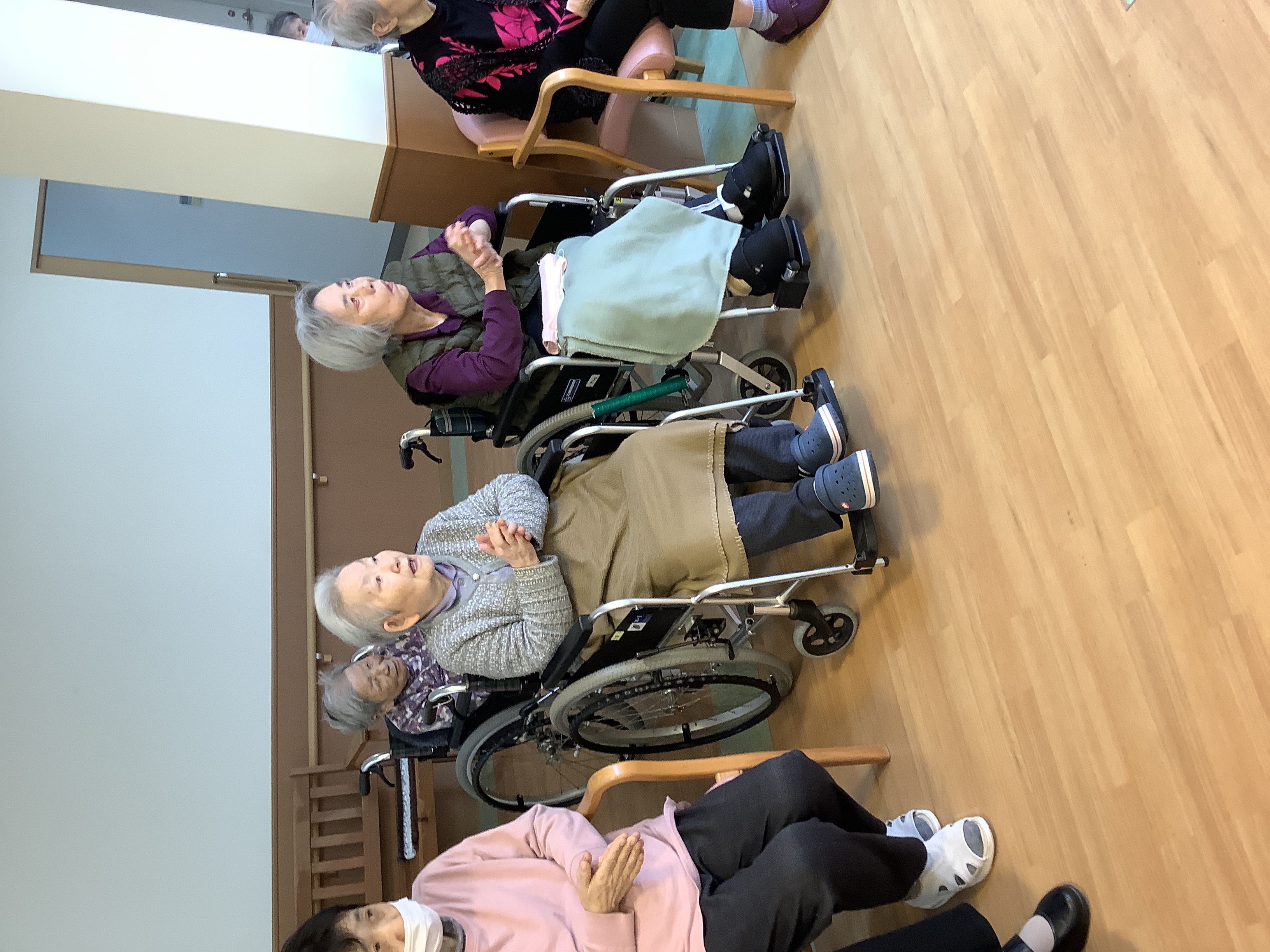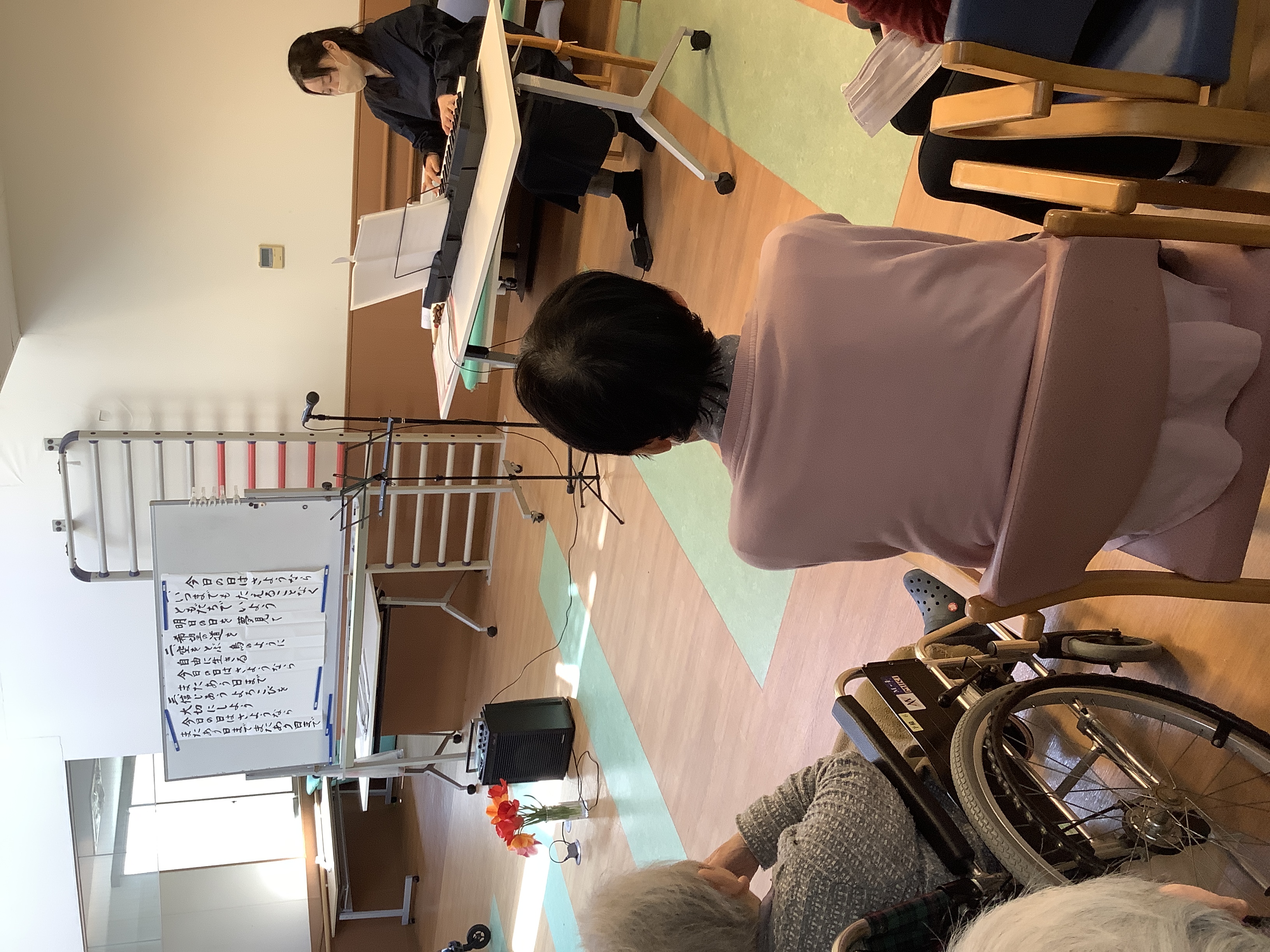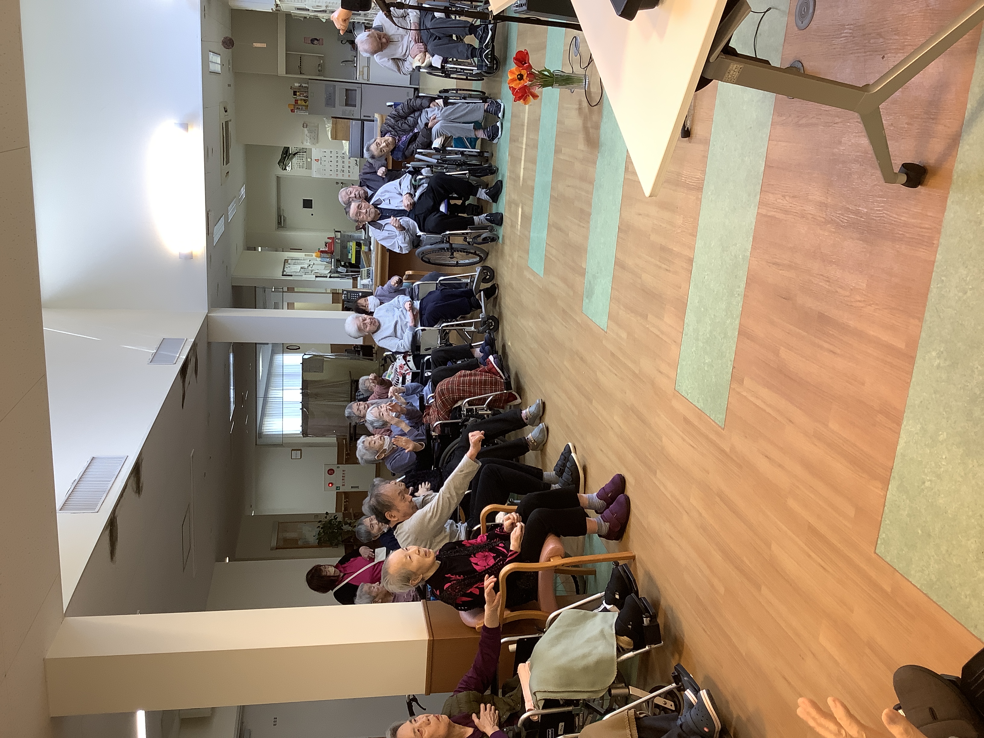 暖かさが増してきた4月、今月も音楽療法の時間がやってきました。 今回はいつもより多くの利用者様にご参加いただき、ホールは開始前からにぎやかな雰囲気に包まれていました。